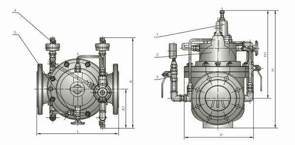 1、导阀2、主阀3、球阀4、压力表5、针阀